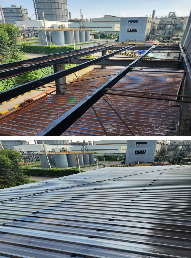 本次修缮工程分为旧瓦拆除、承重梁加固、钢梁除锈刷漆、新瓦铺设四个环节。为确保施工安全,生产部提前对作业人员开展安全技术交底,明确高处作业、动火作业等安全规范;施工人员全程佩戴安全帽、系好安全带,严格落实安全防护措施,规范搭设作业平台,杜绝违章作业行为。经过4天连续作业,员工休息室屋面修缮工程顺利完成。全新铺设的彩钢瓦屋面平整光亮,彻底解决了锈蚀漏雨问题。